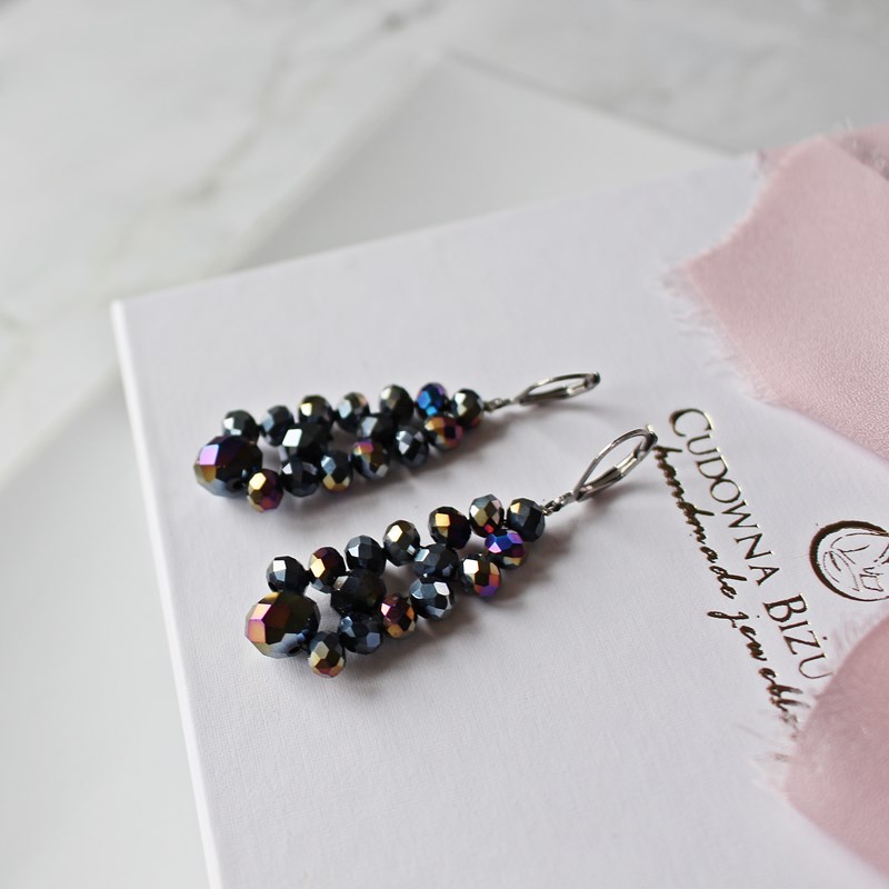 Oferuje kolczyki w pięknym czarnym kolorze z tęczową poświatą. Biżuteria wykonana ze szklanych fasetowanych kryształów.