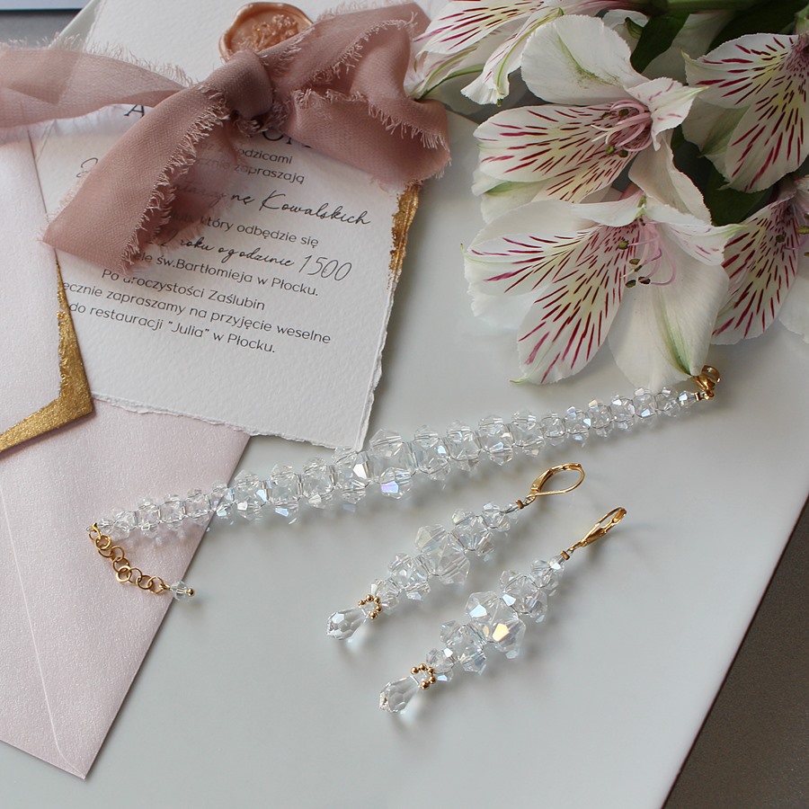 Końcowy element w kolczykach, podkreślający kobiecość zestawu, to kryształowa łezka Swarovskiego.