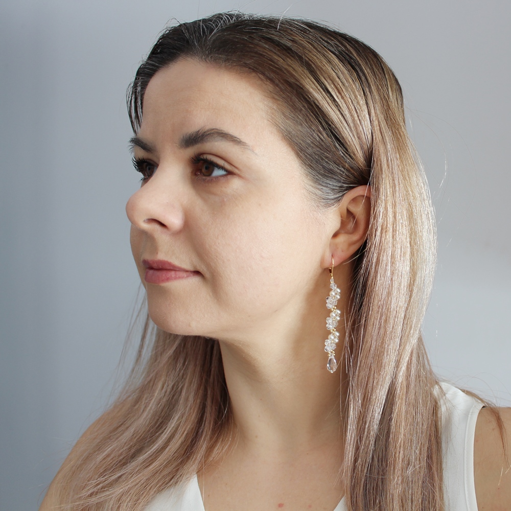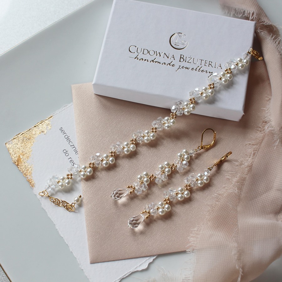 Kolory: przezroczysty z lekką tęczową poświatą oraz białe szklane perełki. Wykończenie w kolorze złotym ze stali nierdzewnej.