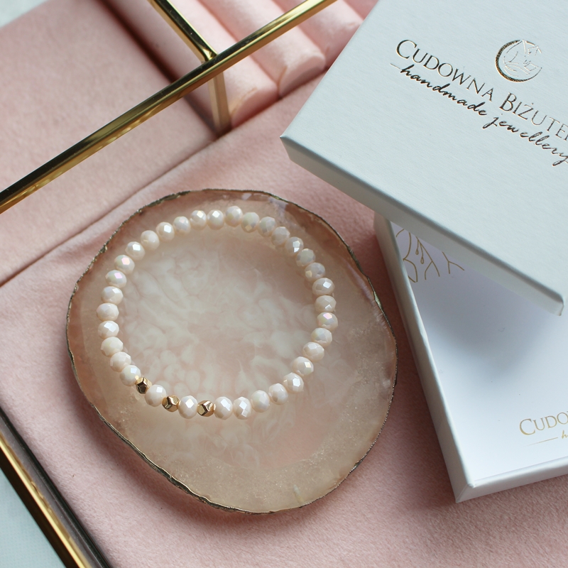 Polecam piękną, delikatnie połyskującą kryształową bransoletkę w kolorze kremowym z trzema kamieniami hematytu platerowanego na kolor złota.