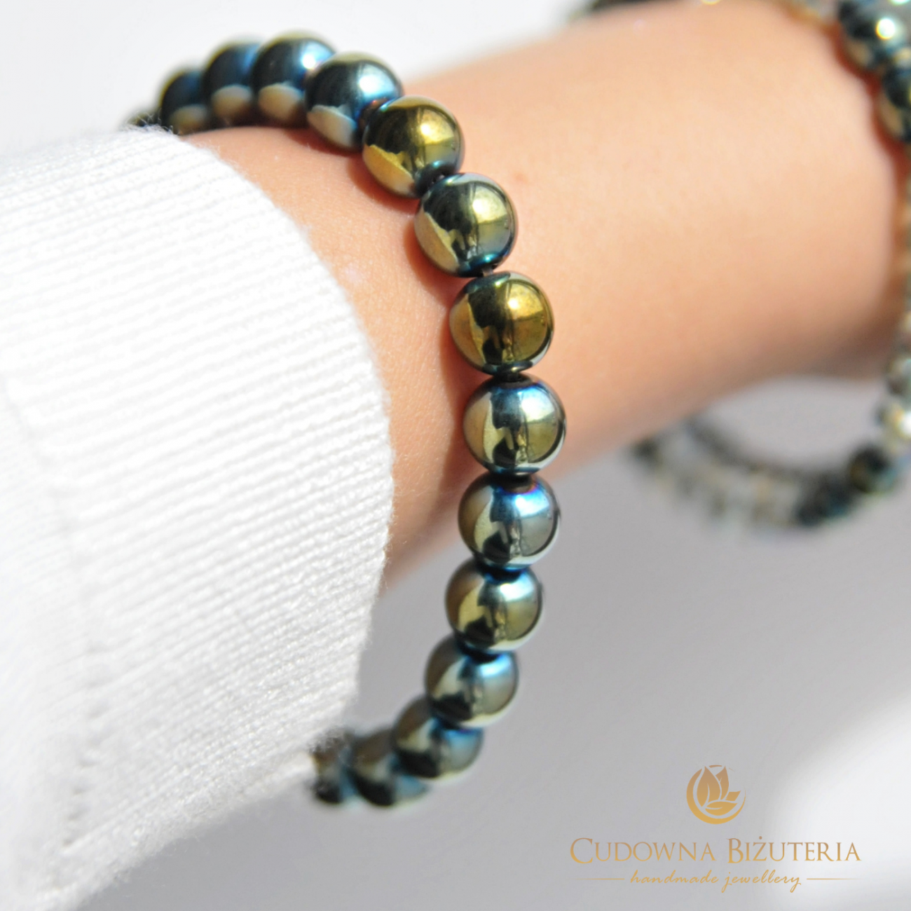 Proponujemy bransoletkę w całości wykonaną z hematytu. Kamień ten jest ceniony przez kobiety ze względu na swoje właściwości oraz walory wizualne. Kamyczki nie tracą koloru ani blasku, nawet przy częstym noszeniu.