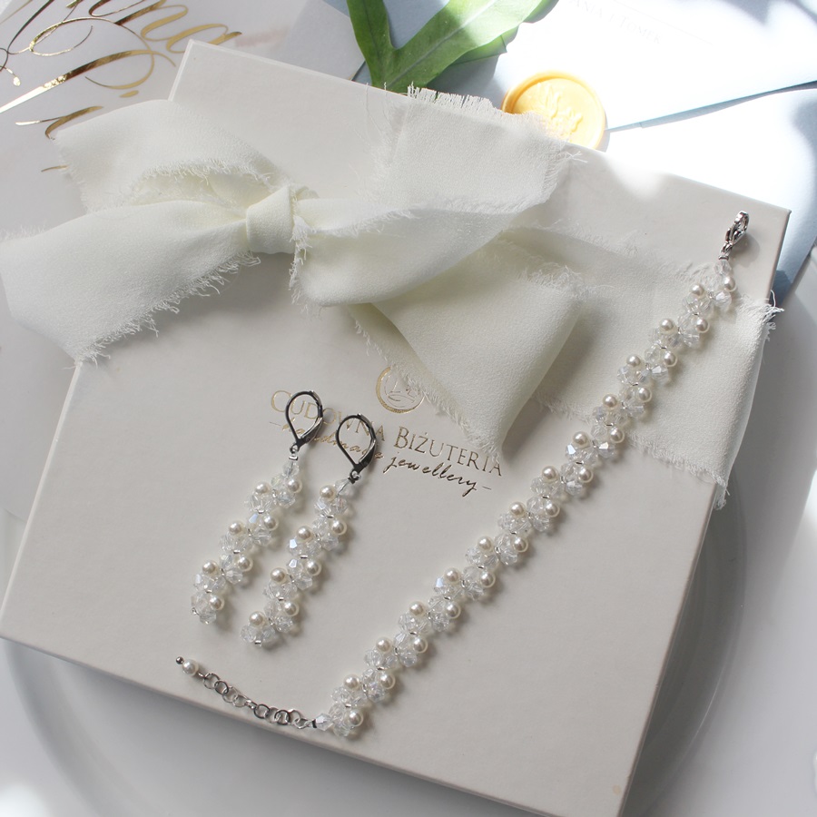 Zestaw powstał ze szklanych fasetowanych kryształów w kolorze Crystal AB, białych perełek i srebrnych szklanych koralików łączących wzór.