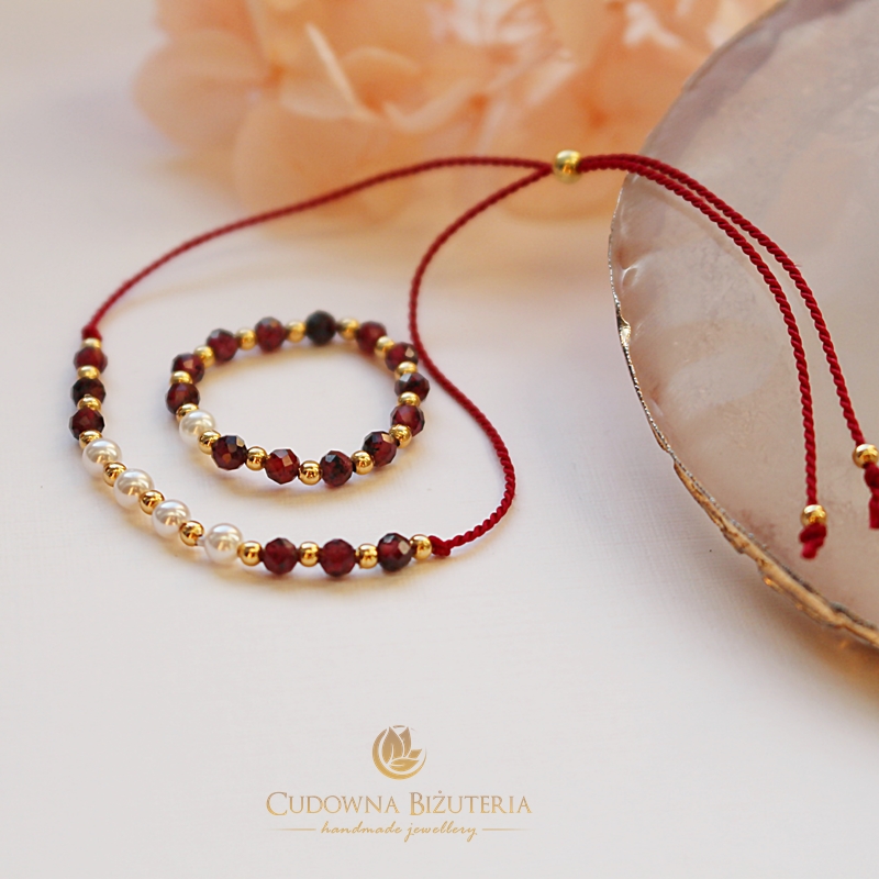 Oferujemy piękną bransoletkę wykonaną z kamieni granatu oraz pereł z rodzaju Majorka.