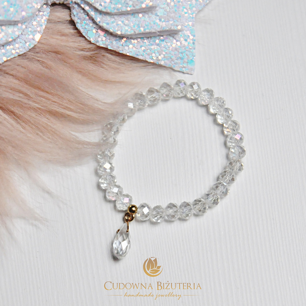 Prezentowana bransoletka wykonana została z kryształów w przezroczystym kolorze. Atutem bransoletki jest zawieszka w kształcie kropelki zamontowana do ozdobnej złotej krawatki. Rozmiar kryształów 6mm.