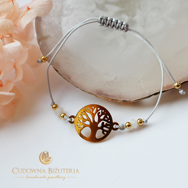 W tym ogłoszeniu zamówisz model w kolorze szarym z kamieniami białego jadeitu. Złote elementy widoczne na zdjęciu to stal szlachetna.