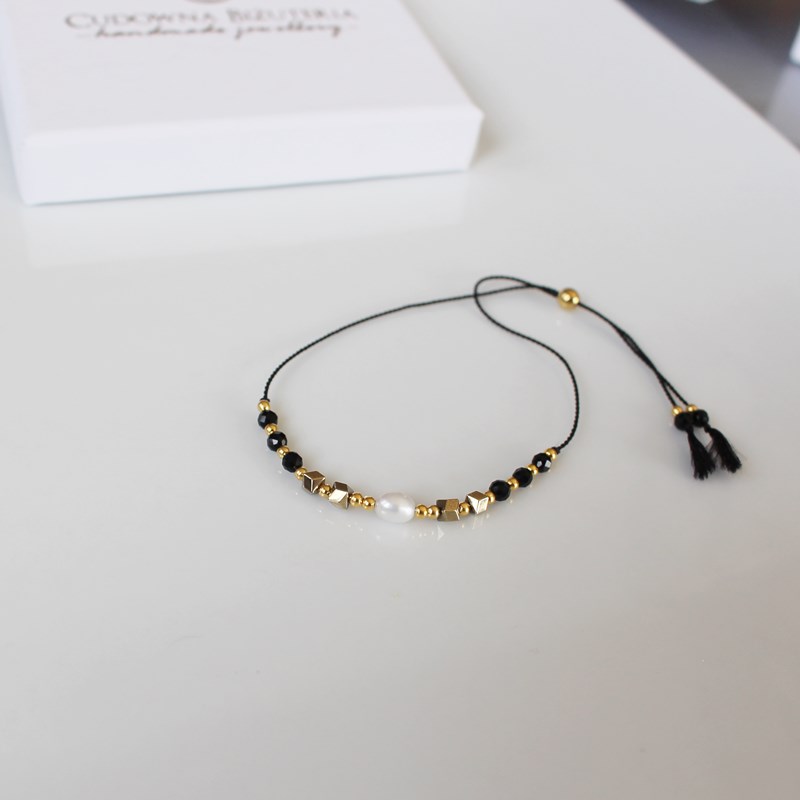 W centralnej części bransoletki znajduje się biała perełka. Następnie kosteczki złotego hematytu i czarny spinel. Dodatki ze stali nierdzewnej w kolorze złotym.