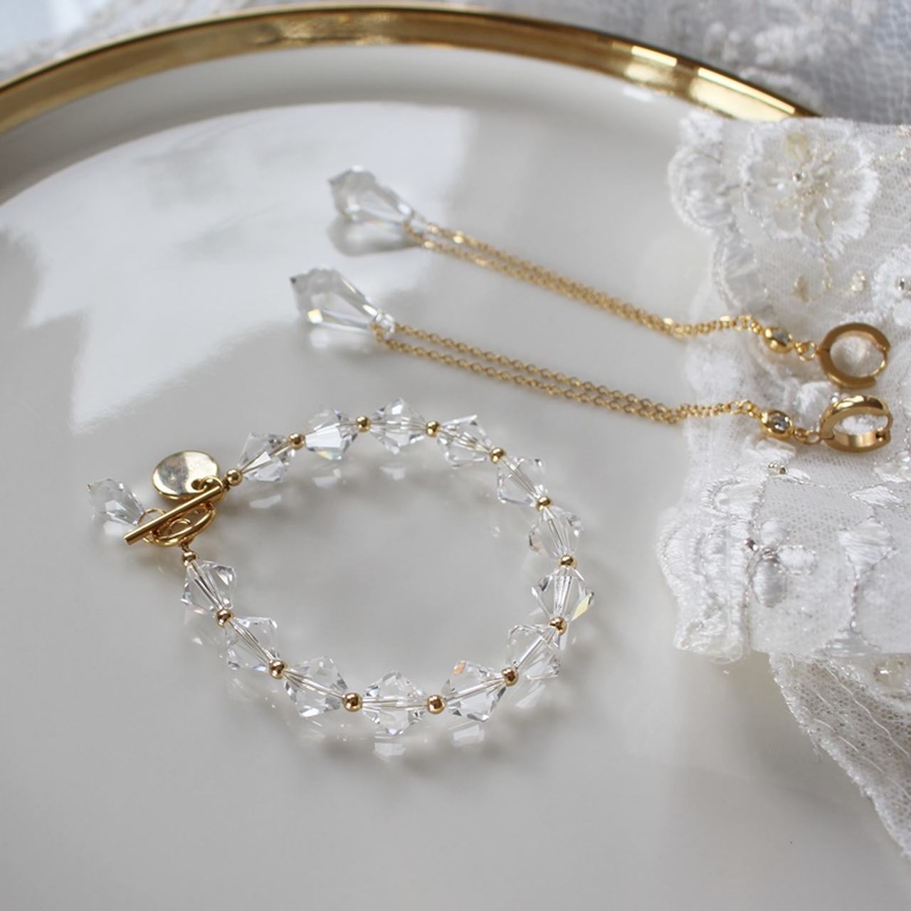 Bransoletka w składzie posiada kryształy w kształcie diamentów o wielkości 10 mm oraz kryształek kropelkę przy zapięciu.
