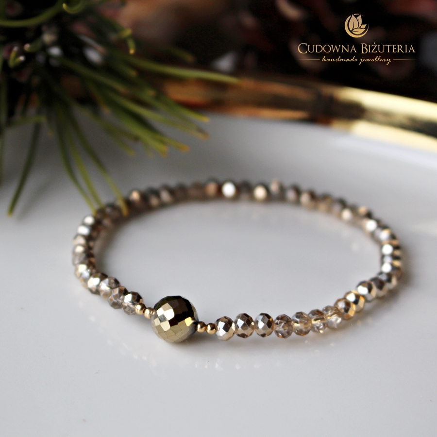 Kolor kryształków piękne kryształowe, przecierane złoto. Okrągła kuleczka pirytowego złota oddzielona została od kryształków kuleczkami pozłacanej stali szlachetnej.