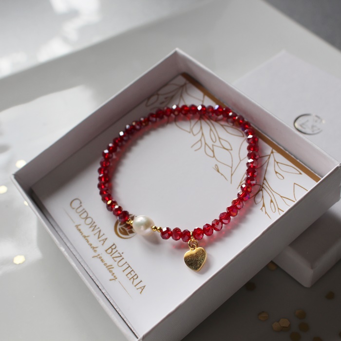 Oferuję czerwoną kryształową bransoletkę z zawieszką w kształcie serduszka.