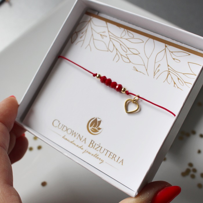 W centralnej części bransoletki znajdują się czerwone kryształki z kuleczkami ze stali chirurgicznej w kolorze złotym oraz piękna zawieszka serduszko.