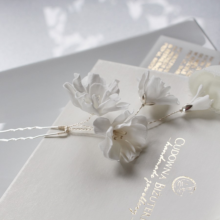 Model sprawdzi się jako ozdoba nad ucho, do wpięcia w kok i luźny warkocz. Kwiaty są na elastycznych drucikach i można je ułożyć dowolnie, dopasowując do linii fryzury.