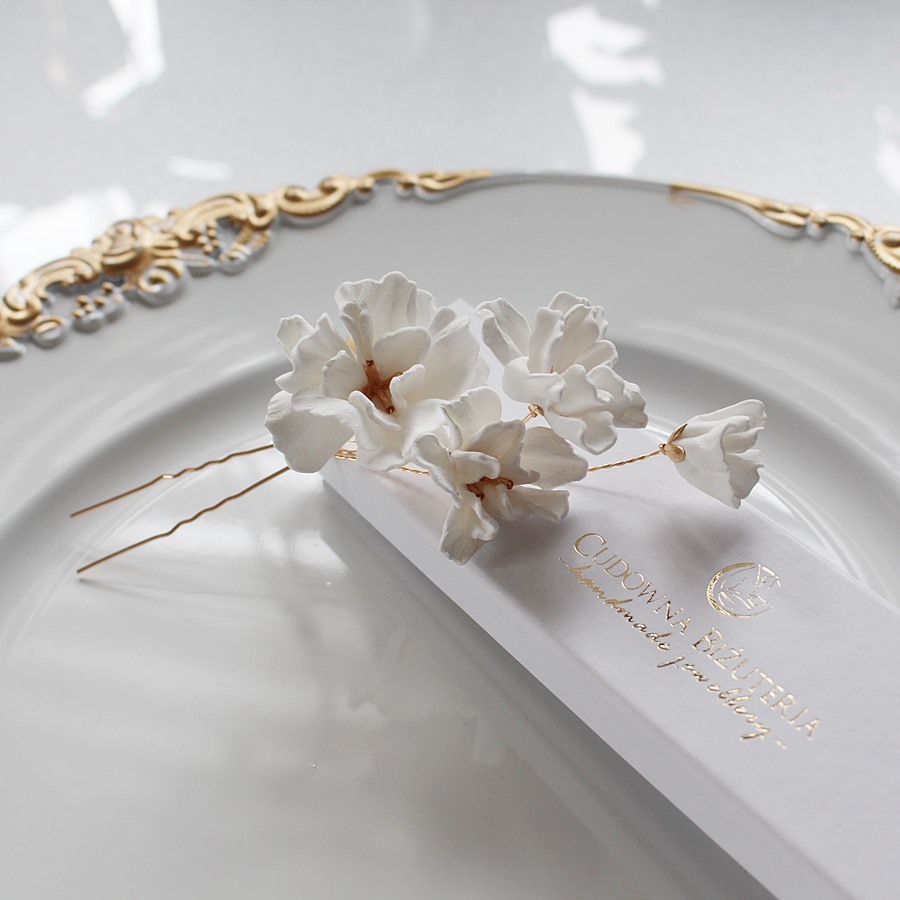 Model sprawdzi się jako ozdoba nad ucho, do wpięcia w kok i luźny warkocz. Kwiaty są na elastycznych drucikach i można je ułożyć dowolnie, dopasowując do linii fryzury.