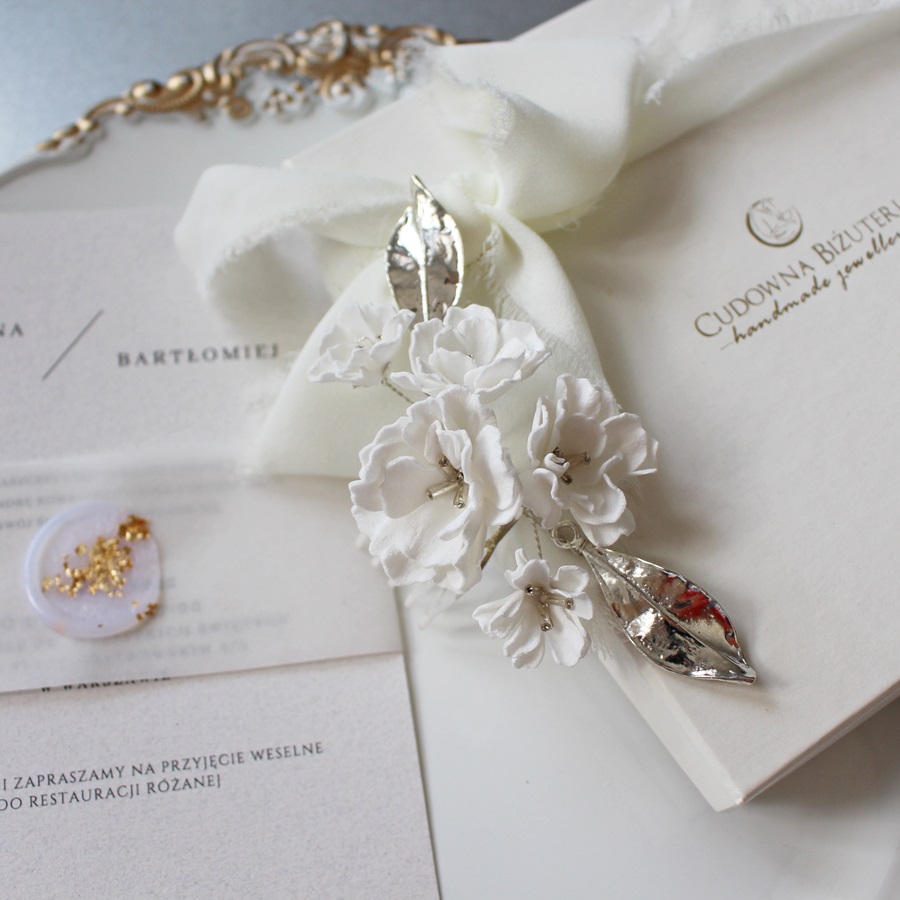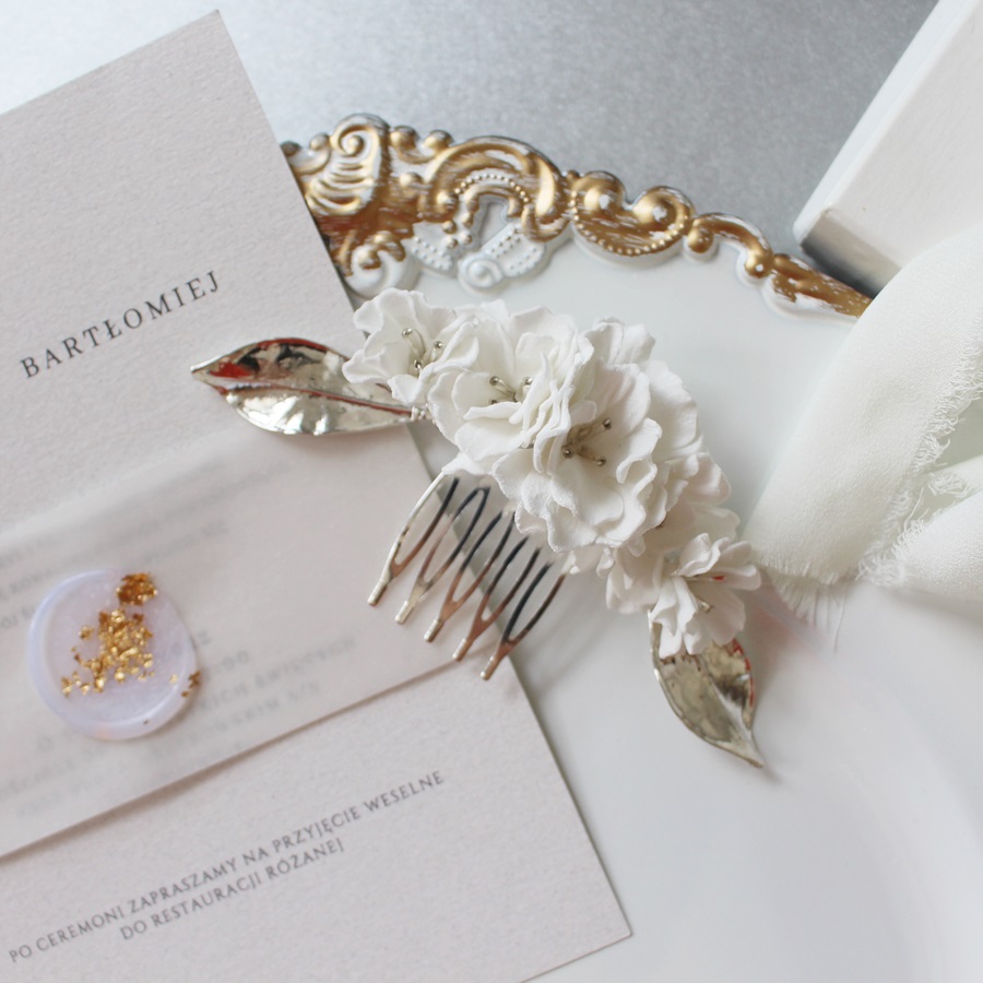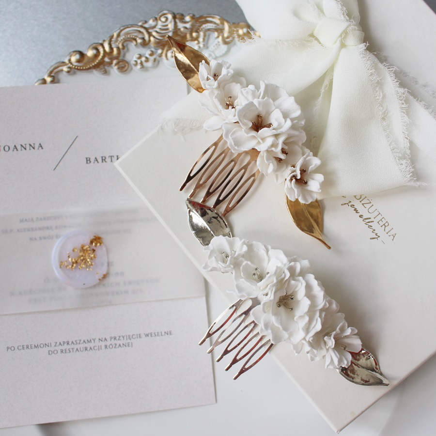 Model niezwykle uniwersalny - wepniesz do koka, nad uchem i w luźne upięcie a kwiaty dopasujesz do linii fryzury. Każdy element posiada osobne mocowanie, dzięki temu można je przesunąć tak, aby prezentowały się idealnie i współgrały z upięciem.