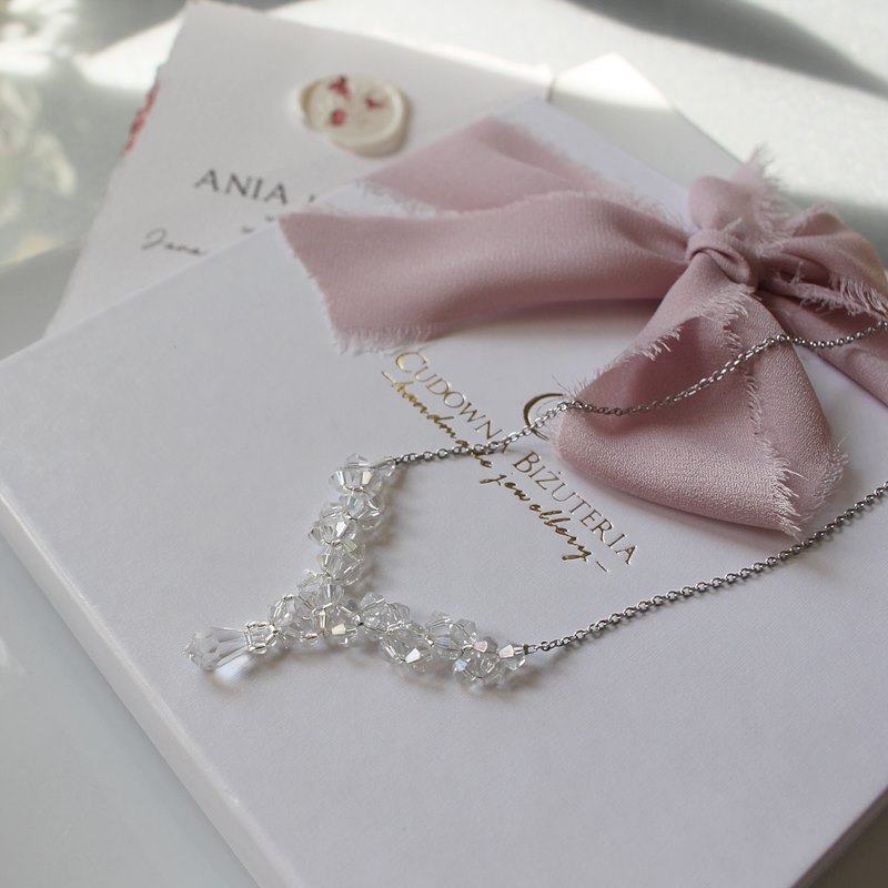 Naszyjnik wykonany został ze szklanych, fasetowanych kryształów w kolorze Crystal Ab. Wykończenie to stal szlachetna w kolorze srebrnym. Środkową część naszyjnika zdobi podwieszony między kryształami kryształ Swarovskiego.