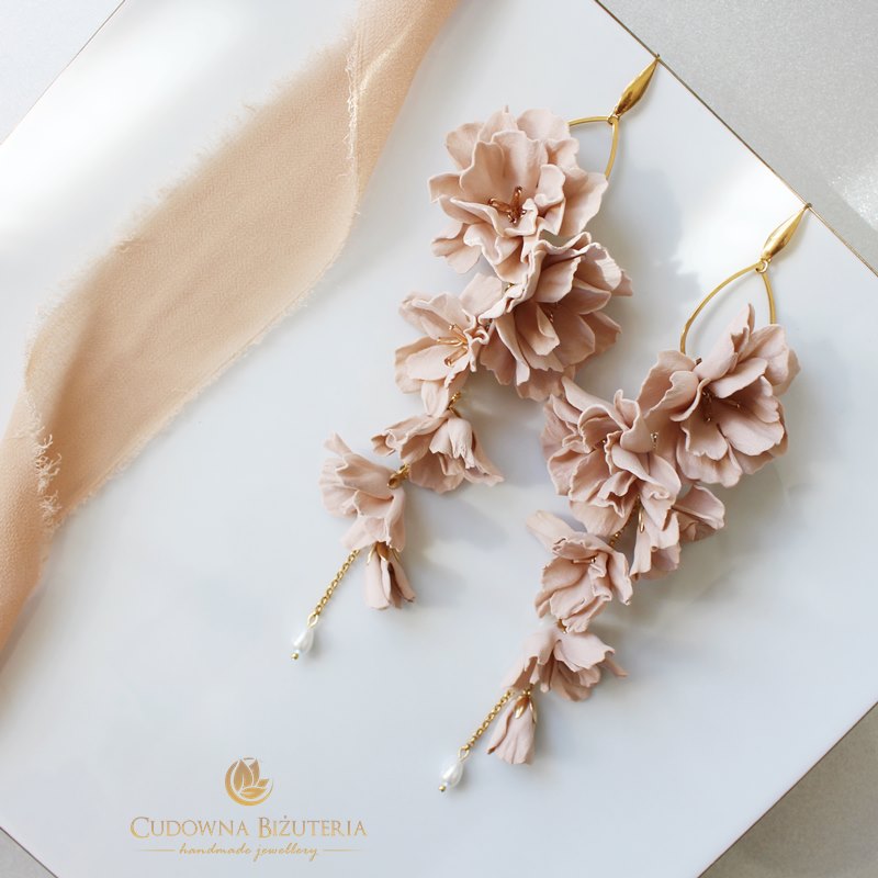 Długie kolczyki z beżowymi kwiatami FLORESSA MAX