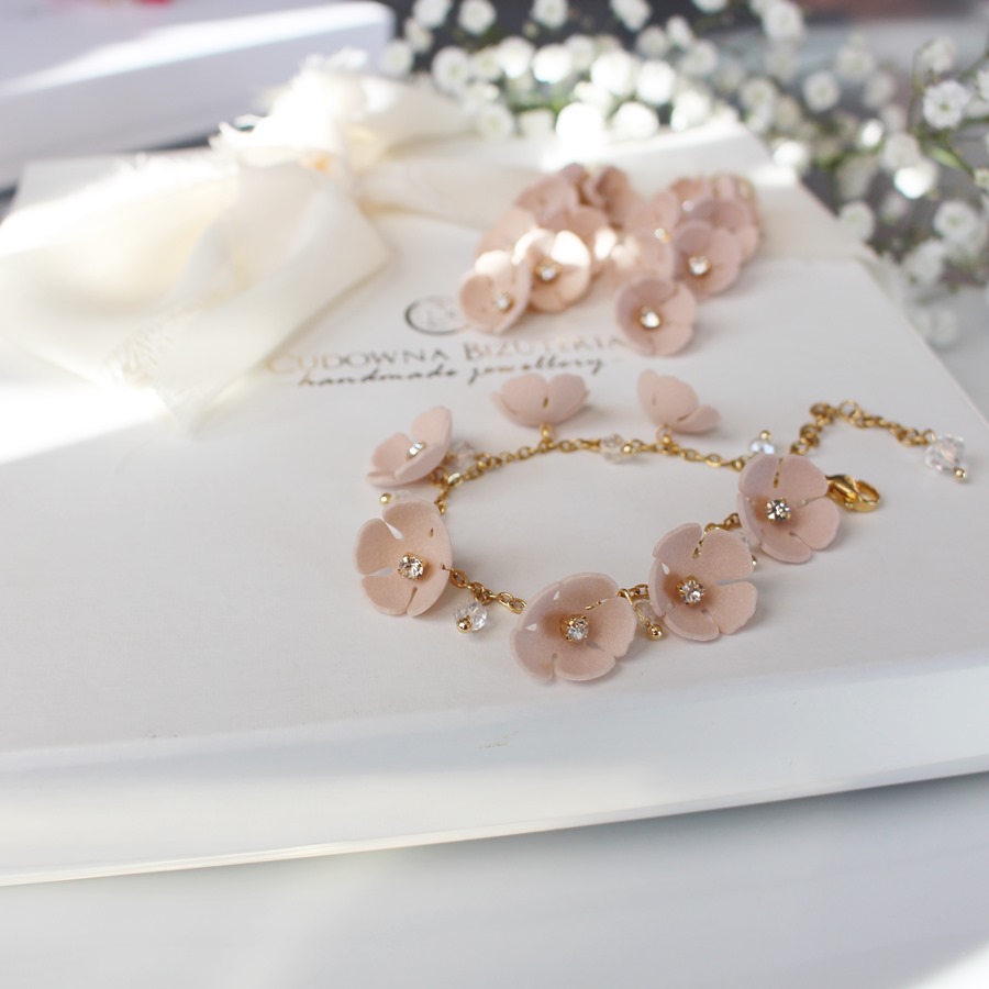 - bransoletka - długość 17 cm plus regulacja 3 cm - 7 kwiatów i delikatne kryształy umiejscowione pomiędzy nimi,