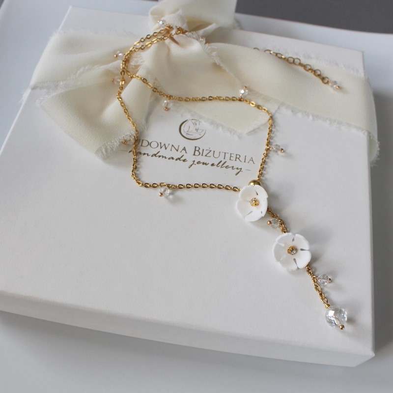 Skład materiałów: stal szlachetna (zapięcia i łańcuszki), kwiaty ręcznie formowane z pianki w kolorze białym, kryształy szklane fasetowane, elementy antyalergiczne.