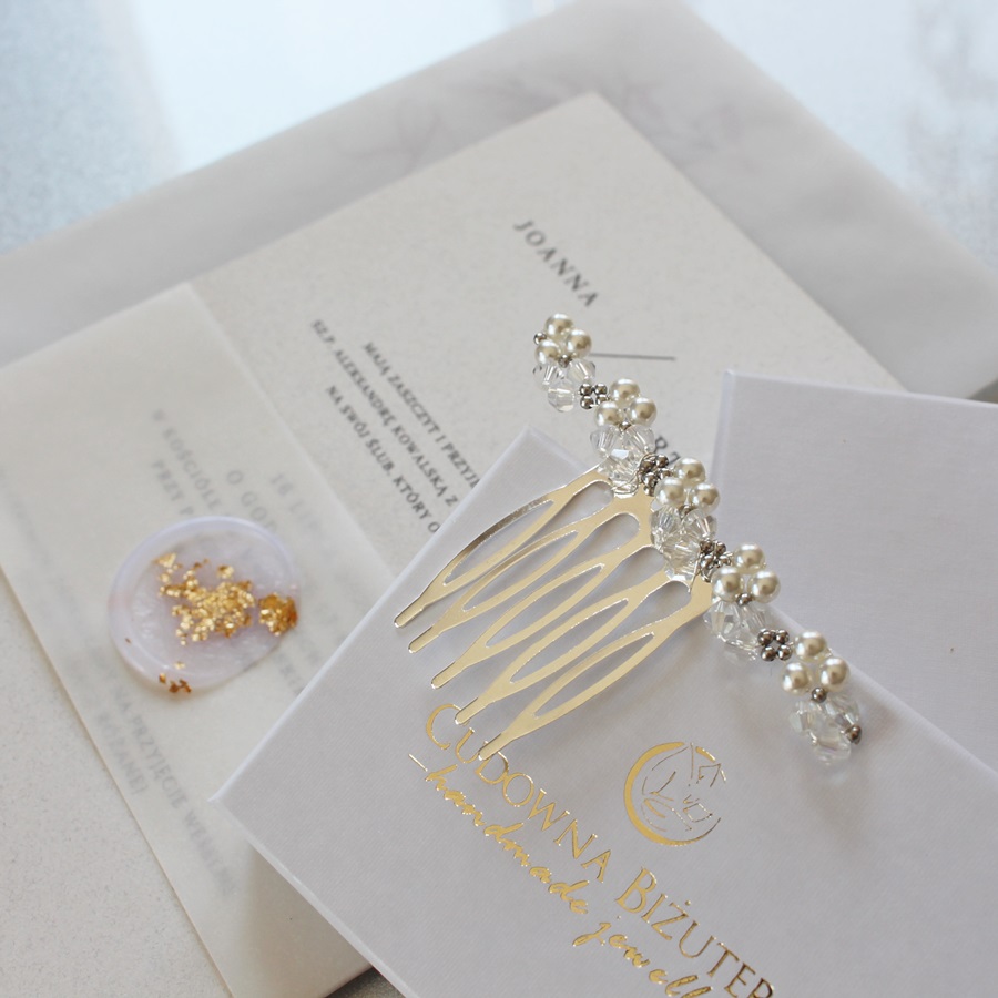 Oferujemy niezwykły, ręcznie wykonany grzebyk ślubny z pięknym zdobieniem.