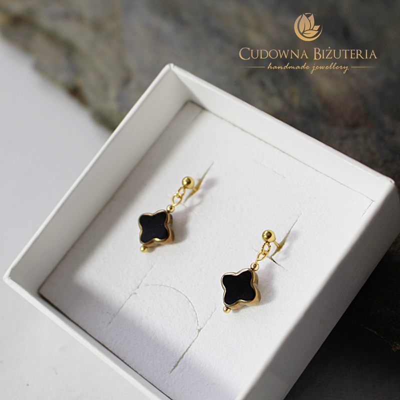 W składzie materiałowym mamy złotą stal szlachetną oraz czarne kryształki w kształcie koniczynki. Krawędź kryształów malowana na złoto.