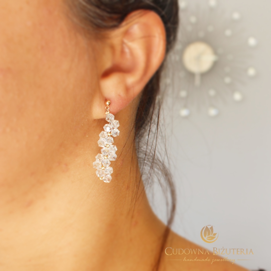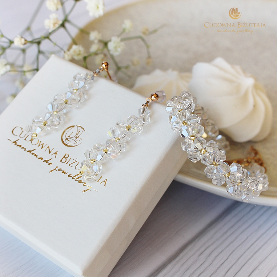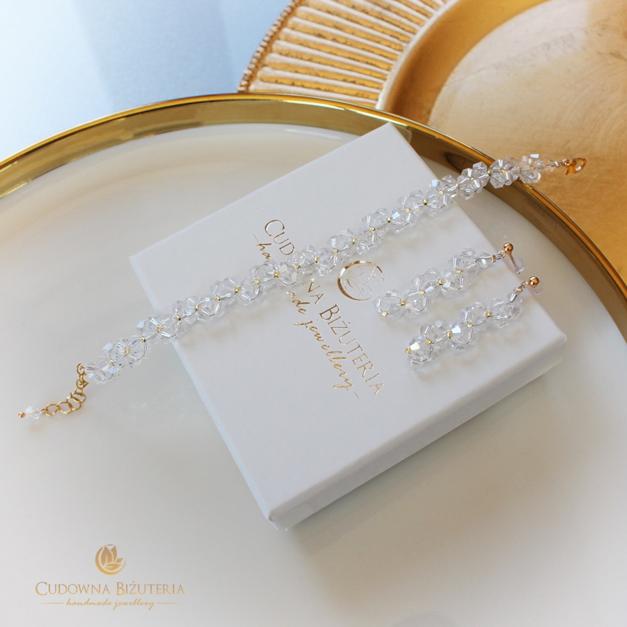 Komplet BELL GOLD II charakteryzuje ciekawa forma ułożenia kryształów. Aby zbudować wzór użyto elementów w rozmiarze 4mm. Dzięki temu zestaw jest subtelny i lekki. Podstawą biżuterii w tej kolekcji jest linka jubilerska stalowa.