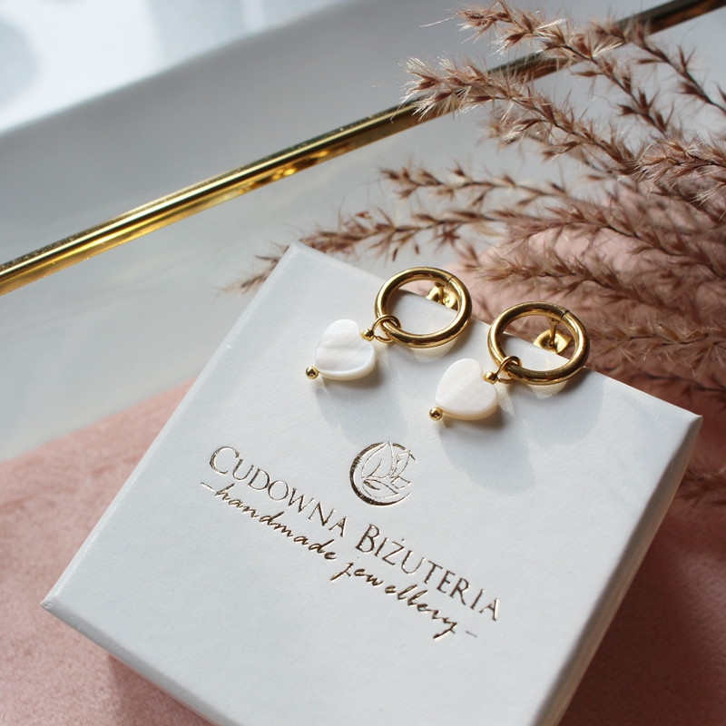 Oferuję kolczyki z serduszkami z masy perłowej.