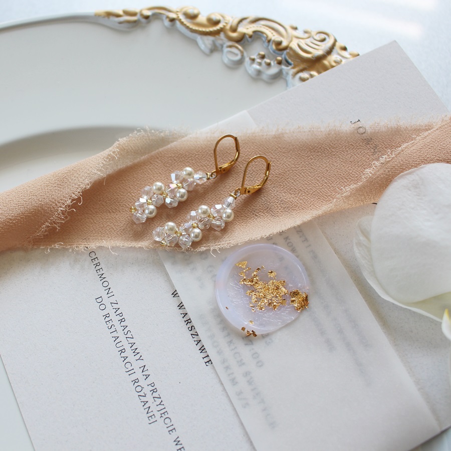 Kolczyki z kolekcji EMMA - przezroczyste szklane kryształki z lekkim połyskiem, białe perełki dopełnione maleńkimi złotymi, szklanymi koralikami.