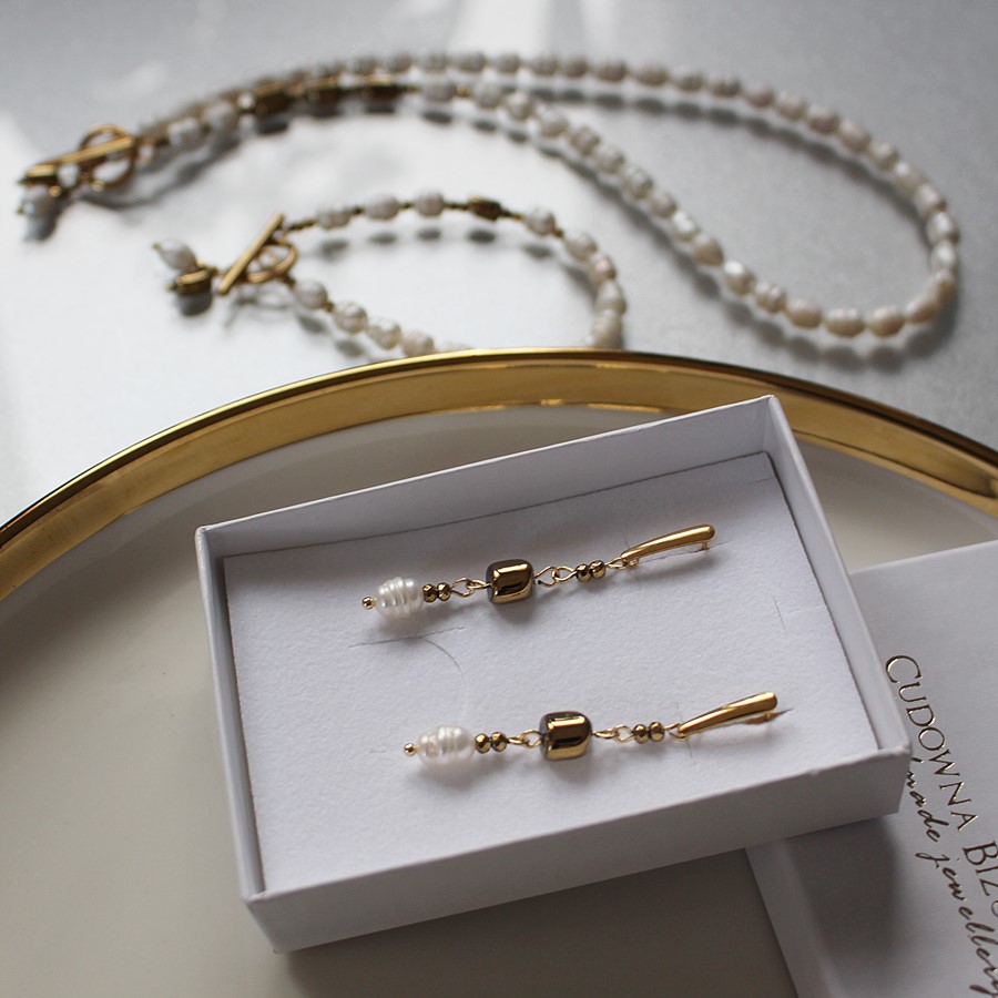 Przedstawiam cudowny zestaw biżuterii z białymi perłami i wkomponowanymi bryłkami złotego hematytu.