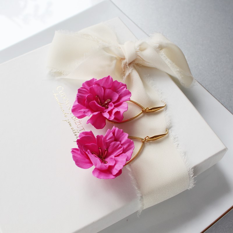 Kolczyki zbudowane z piankowych, ręcznie formowanych kwiatów, elementów ze stali szlachetnej (bazy, łączniki, zapięcia), elementów z metalu biżuteryjnego (ozdobne nakładki na kwiatuszki) oraz szklanych dodatków - wewnętrzne ozdobniki w kwiatach.