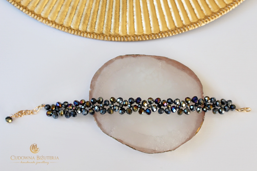 Bransoletka z oferty to model w kolorze czarnym z połyskiem tęczowym z wykończeniem w kolorze złotym ZE STALI CHIRURGICZNEJ.