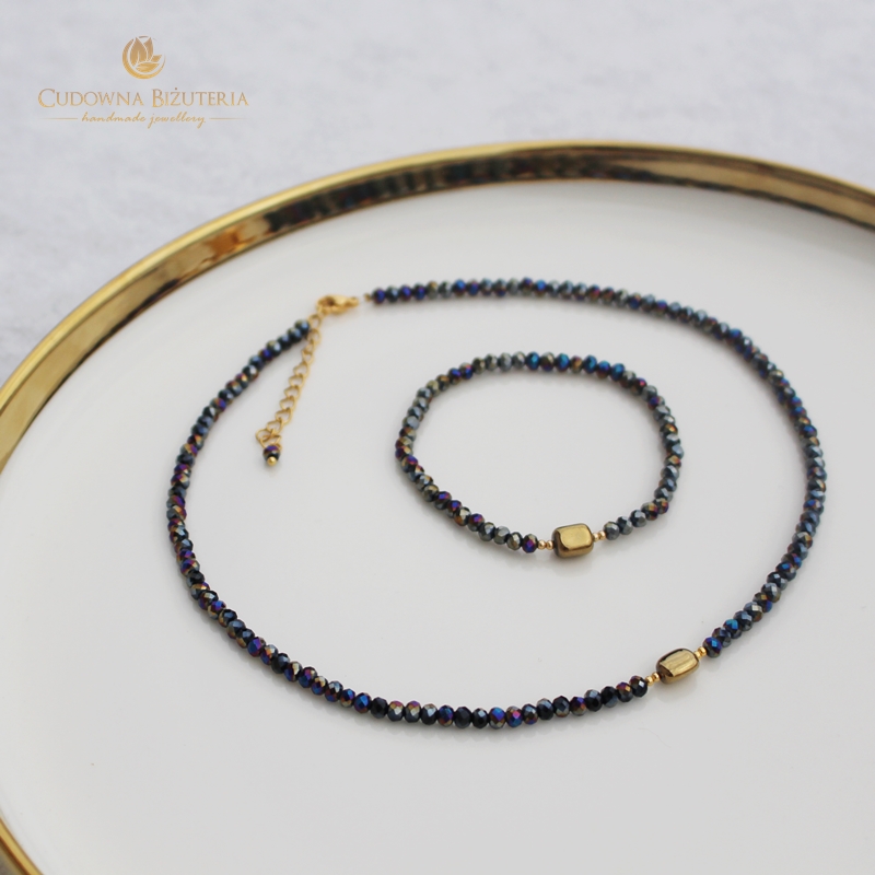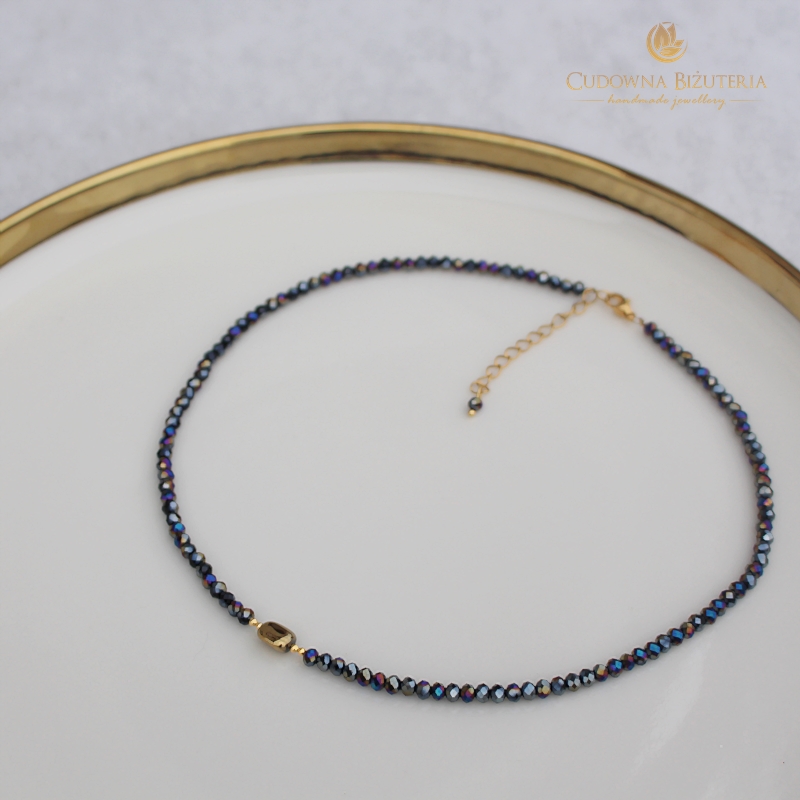 Naszyjnik został wykonany z kryształów szklanych fasetowanych w rozmiarze 4 mm, a jego wykończeniem jest zapięcie ze stali szlachetnej w kolorze złotym. Proponowana przez nas długość to 40 cm plus łańcuszek przedłużający około 5 cm. W centralnej części naszyjnika znajduje się bryłka hematytu w kolorze złotym oddzielona od kryształów kuleczkami ze stali szlachetnej w kolorze złotym.