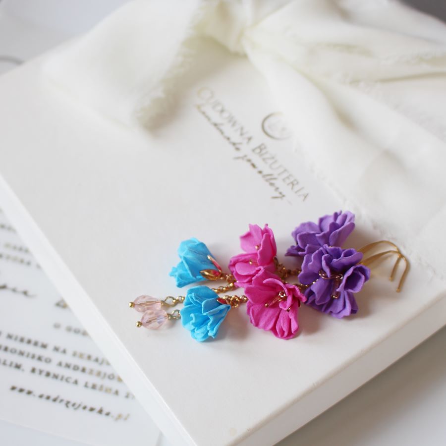 Jest to najkrótsza i najdelikatniejsza wersja kolczyków FLORESSA i w tej ofercie zamawiasz kolczyki z kwiatami w kolorze fiolet - róż - niebieski.