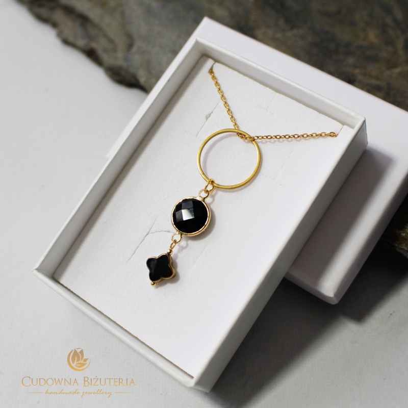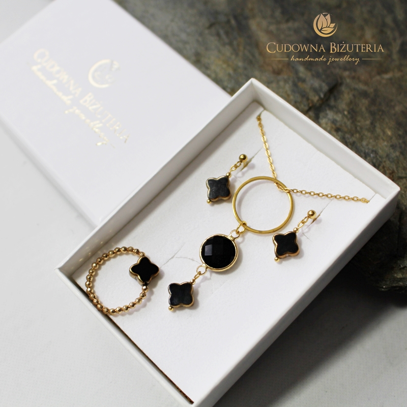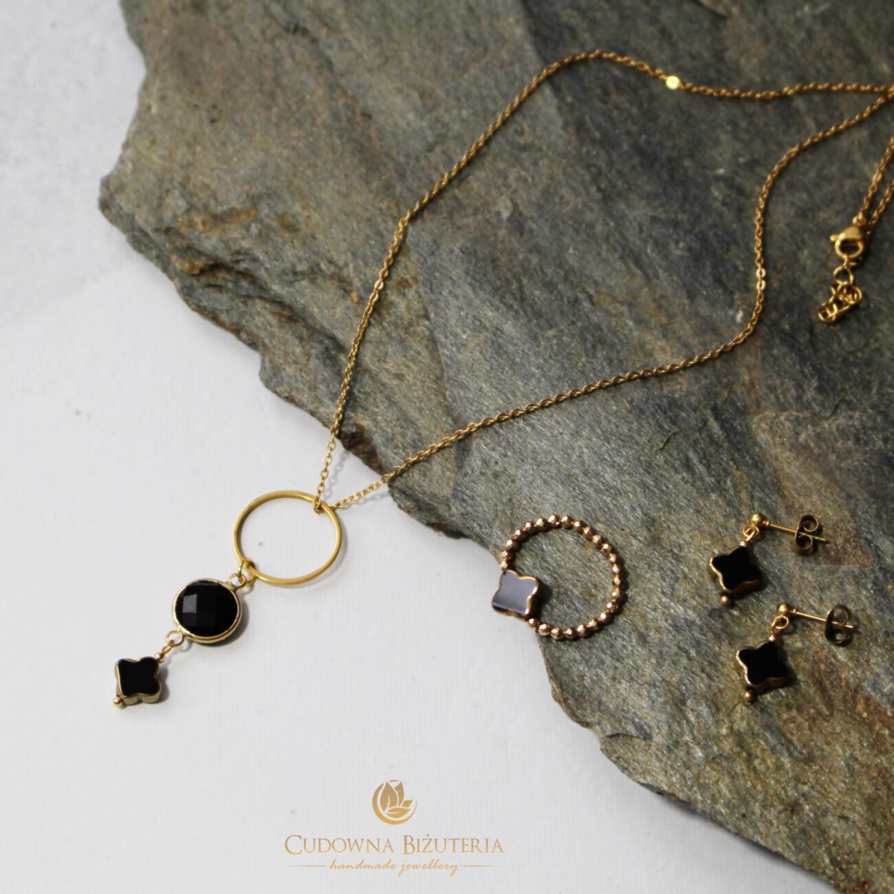 W składzie materiałowym mamy złotą stal szlachetną, czarny kryształ w okuciu w kolorze złata oraz kryształek koniczynkę.