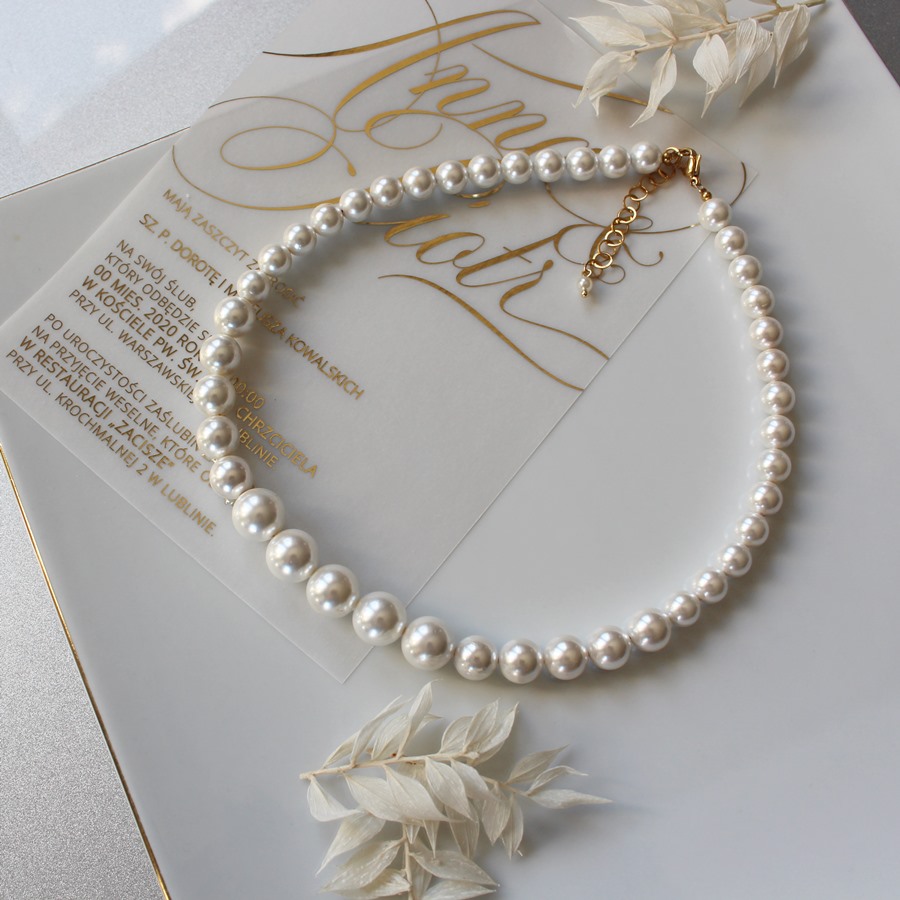 W tej ofercie zamawiasz naszyjnik choker, minimalistyczny i elegancki, idealny dla panien młodych preferujących prostotę. Model zbudowany z pereł w trzech wielkościach, największych na środku, mniejszych przy zapięciu.