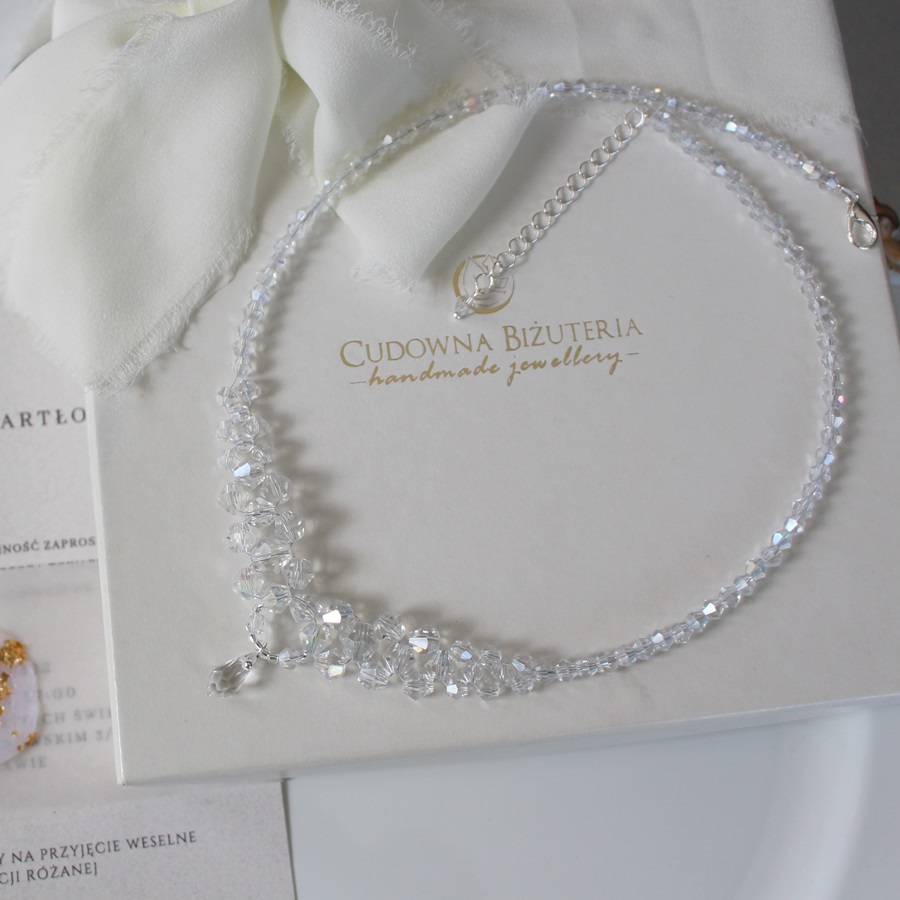 Model powstał z kryształów szklanych fasetowanych w trzech rozmiarach. Dodatkową jego ozdobą jest kryształek kropla, umieszczona w centralnej części naszyjnika. Kryształki  naszyjnika pięknie błyszczą w świetle, a w zestawie z bransoletką i kolczykami tworzy wspaniały komplet.
