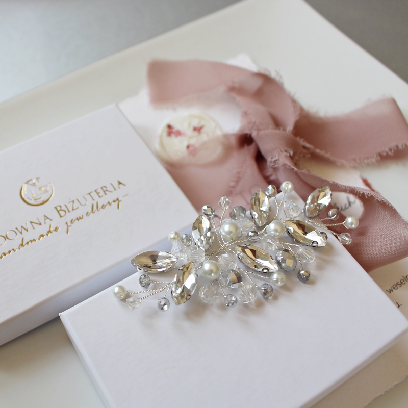 Ozdoba nie posiada żadnych szpilek ani grzebienia, wpiąć ją musi fryzjerka przy układaniu fryzury.