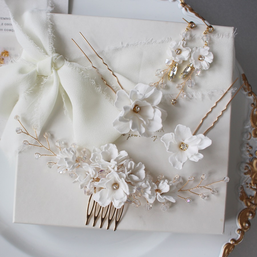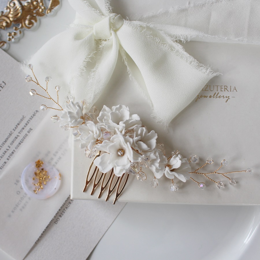 Model zdobią ręcznie formowane białe kwiaty w trzech wielkościach oraz kryształy.