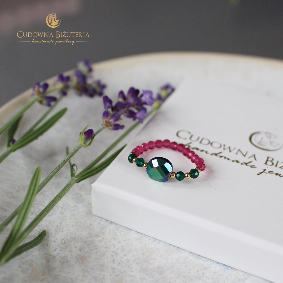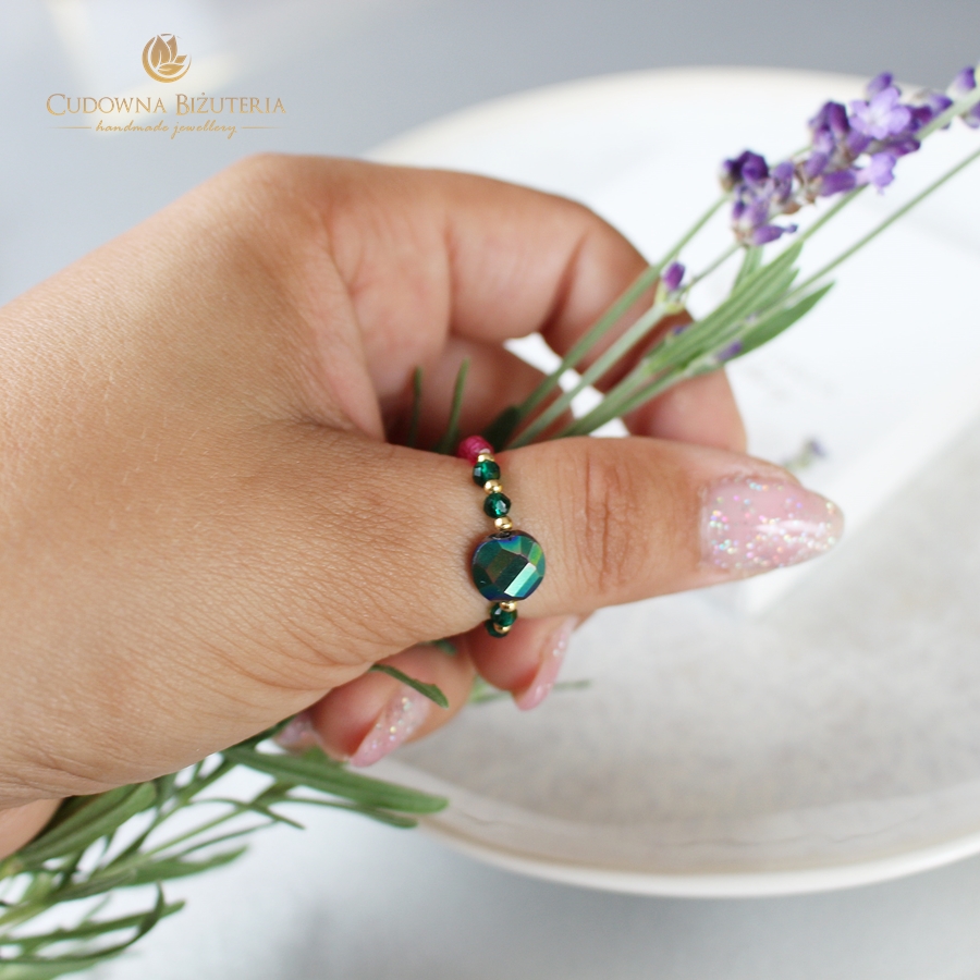 Oferujemy pierścionek elastyczny, w składzie którego znajdują się syntetyczne rubiny i szmaragdy. Największy element to kryształ szklany fasetowany a całość zdobi pozłacana stal szlachetna.
