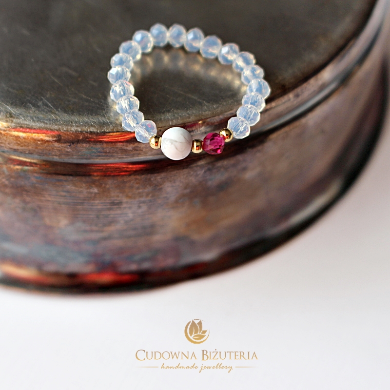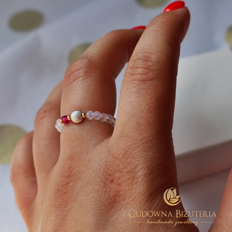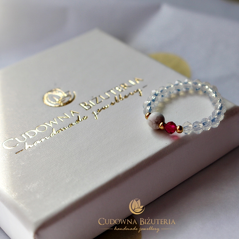 Oferujemy piękny, kryształowy pierścionek z kamieniem białego howlitu i malutkim rubinem.