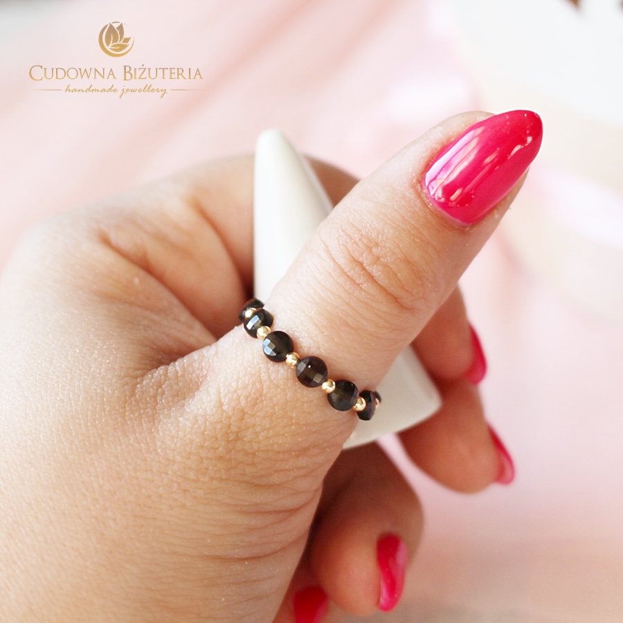 Pierścionek wykonany z kamieni złotego obsydianu i drobnych kuleczek ze stali szlachetnej.