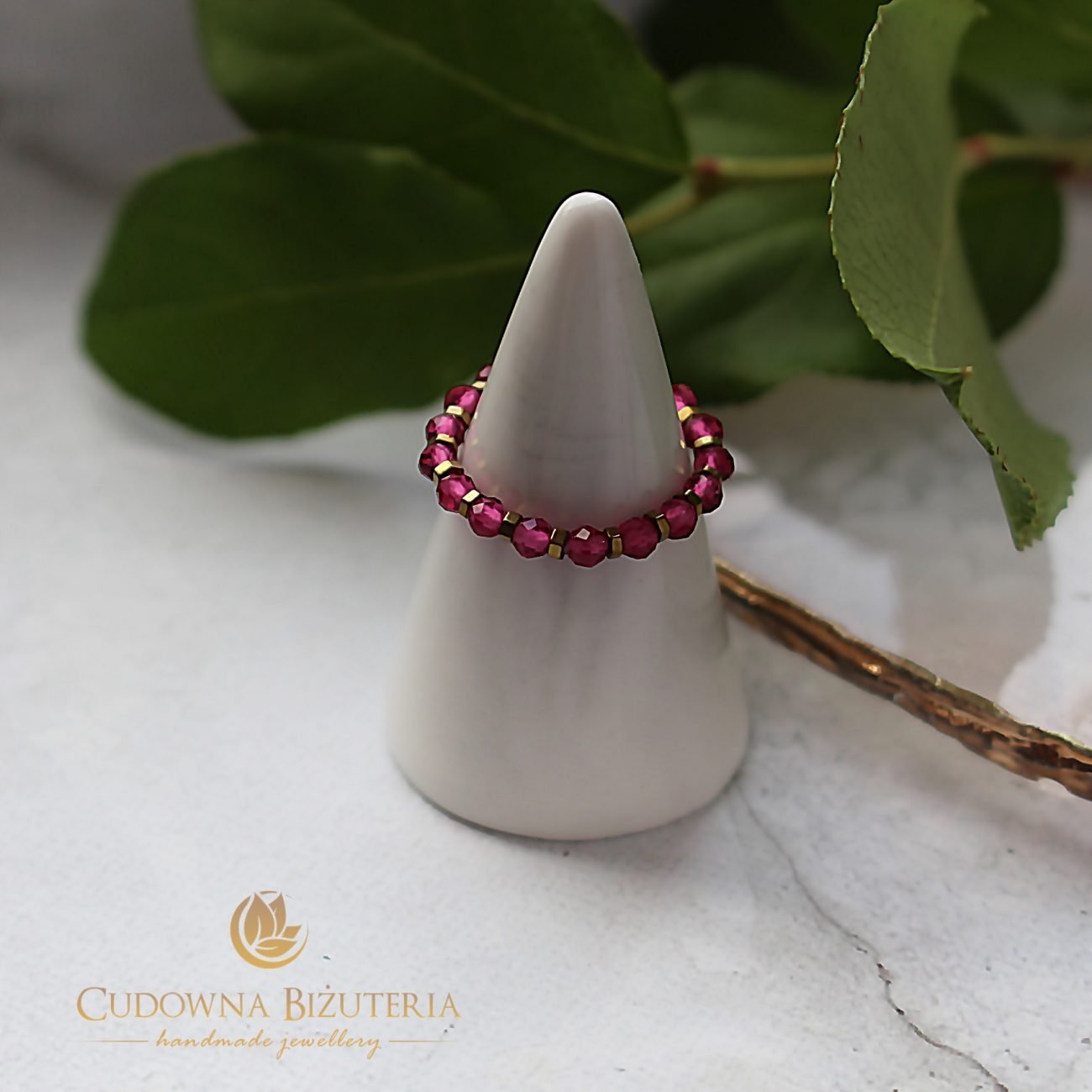 Oferujemy wspaniały pierścionek wykonany z kamieni syntetycznego rubinu z dodatkiem hematytu w kolorze złota.