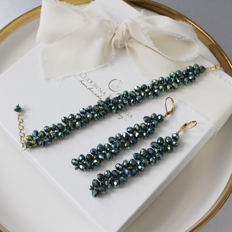 Komplet Rio II to elegancki zestaw kuszący długimi, efektywnymi kolczykami. Modele wykonane są ze szklanych fasetowanych kryształów w rozmiarach 4mm i 6mm. Podstawą biżuterii w tej kolekcji jest linka jubilerska stalowa. Kolekcja cieszy się ogromną popularnością wśród klientów ze względu na ciekawy układ kryształów oraz kolor, pasujący do wielu stylizacji.
