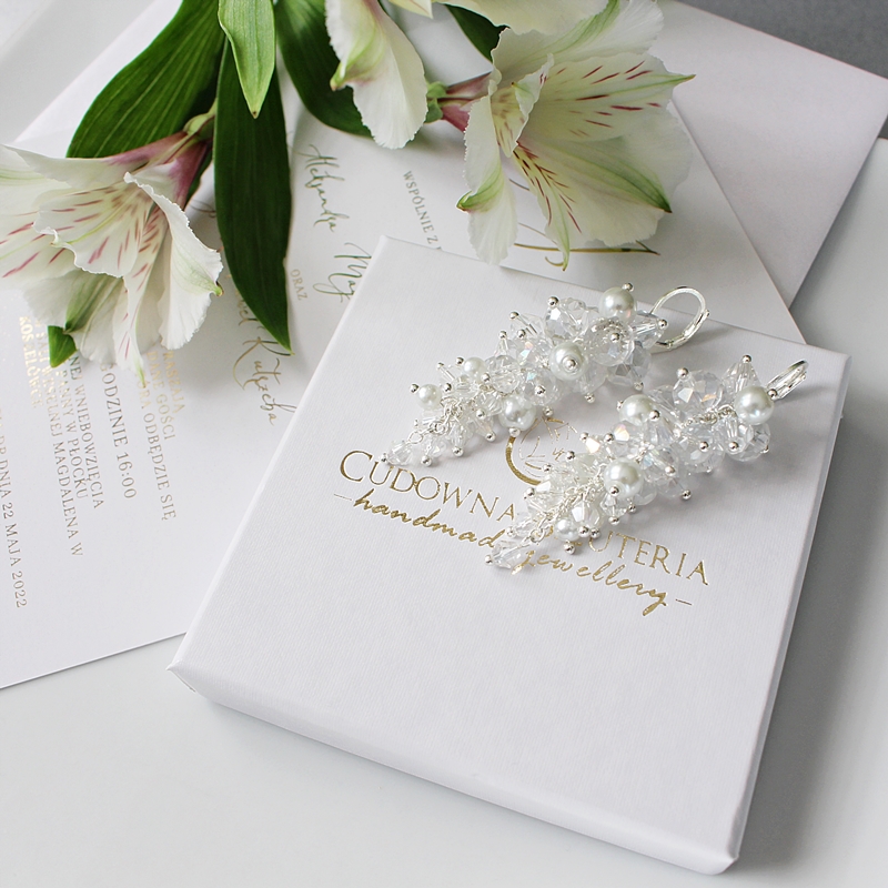 Kolory w tym modelu to: biała perełka, kryształy bicone w wersji Crystal AB i przezroczyste oponki fasetowane. Wykończenie w kolorze srebra z metalu biżuteryjnego.