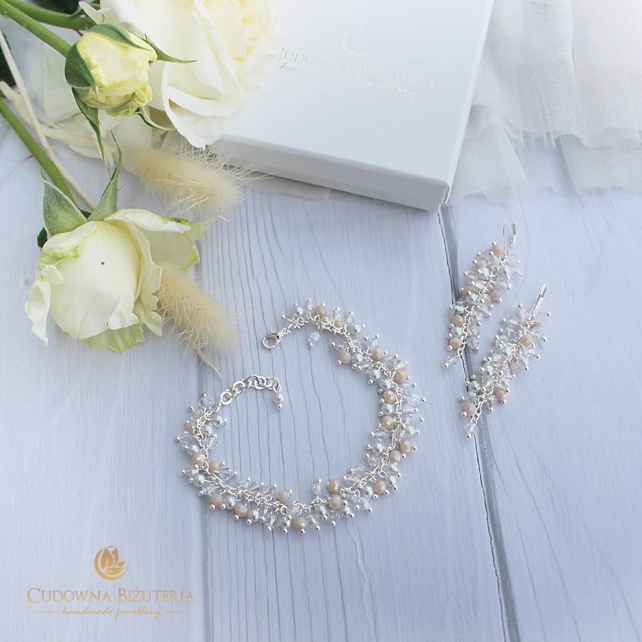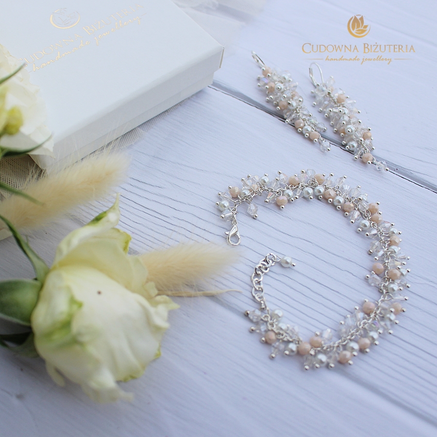 W tej ofercie zamówisz kolczyki oraz bransoletkę z kolekcji SARA - wersja z wykończeniem w kolorze srebrnym z dodatkiem kremowych kryształków i perełek.