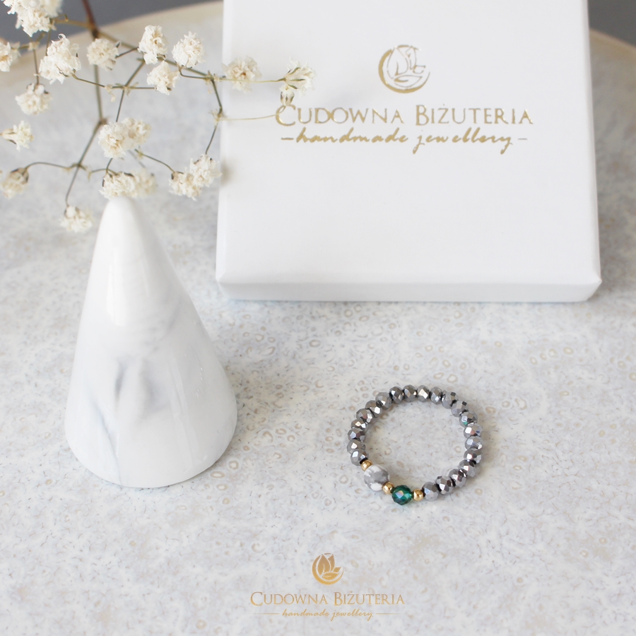 Ozdobna część modelu to dwa kamienie znajdujące się w centralnej jego części - matowiony biały howlit i szmaragd.