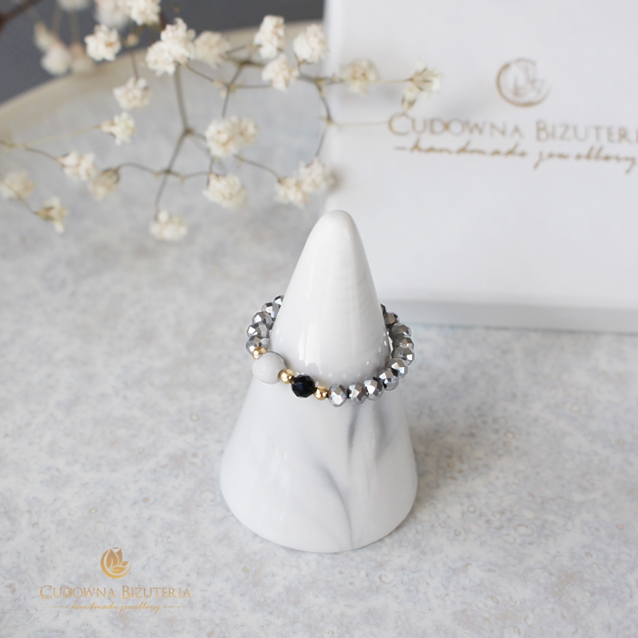 Ozdobna część modelu to dwa kamienie znajdujące się w centralnej jego części - matowiony biały howlit i czarny spinel.