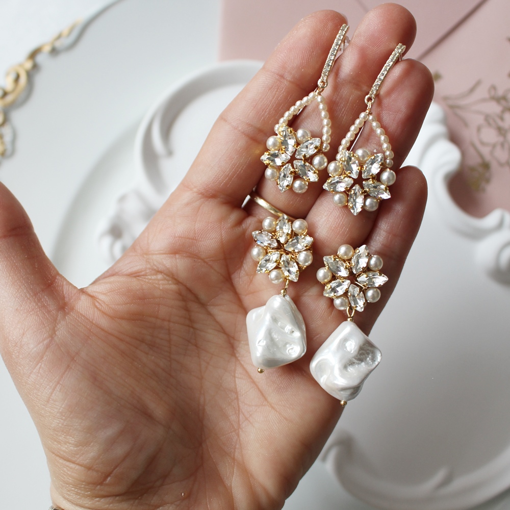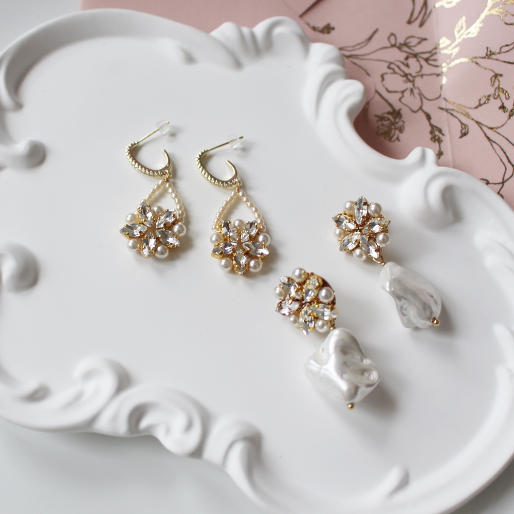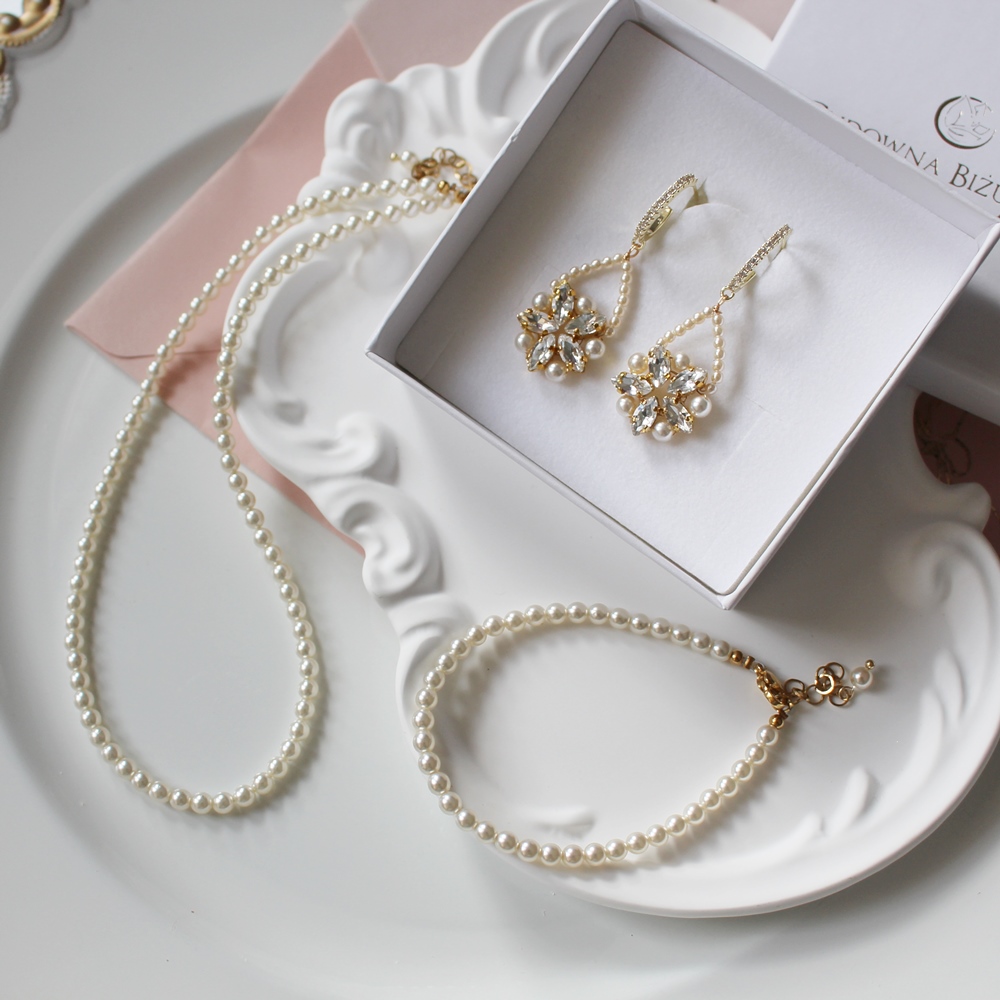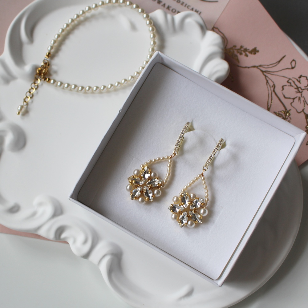 Skład materiałów: cyrkonie w okuciach, perły szklane oraz zapięcia mosiężne sztyfty wysadzane cyrkoniami.