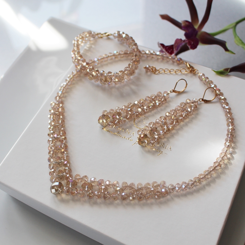 Oferuję komplet składający się z naszyjnika, bransoletki i kolczyków w pięknym złotym kolorze. Biżuteria wykonana ze szklanych fasetowanych kryształów. Komplet pleciony na stalowej lince jubilerskiej co gwarantuje niezawodność przez długi czas.