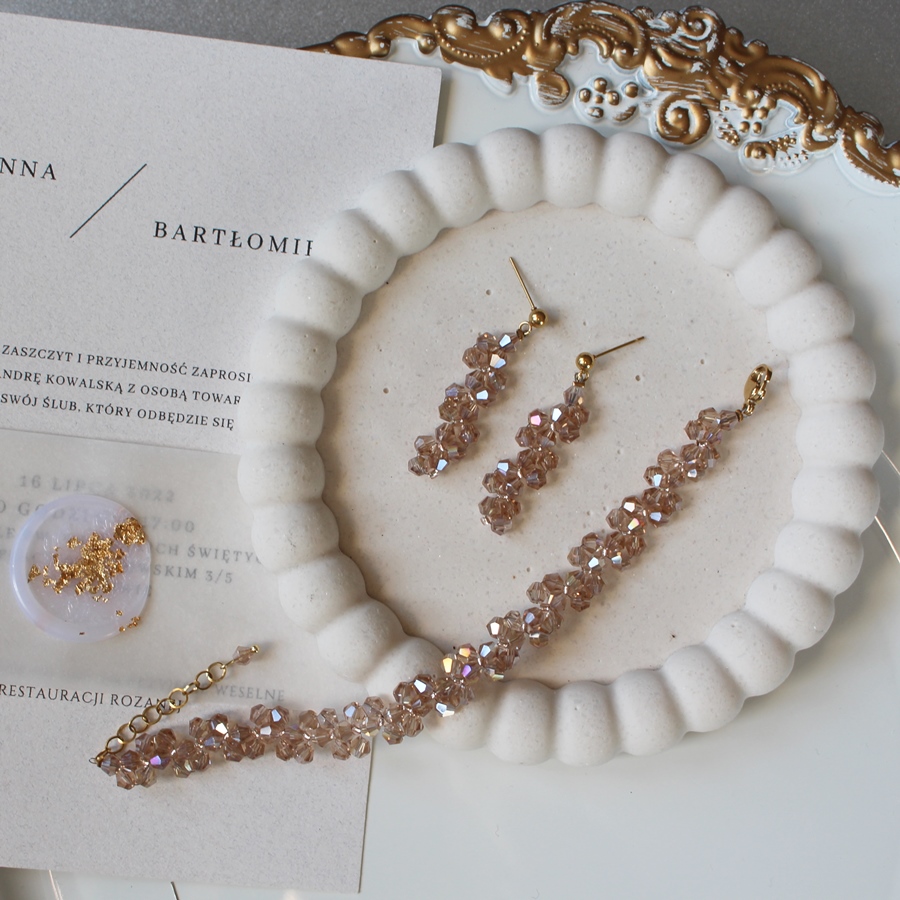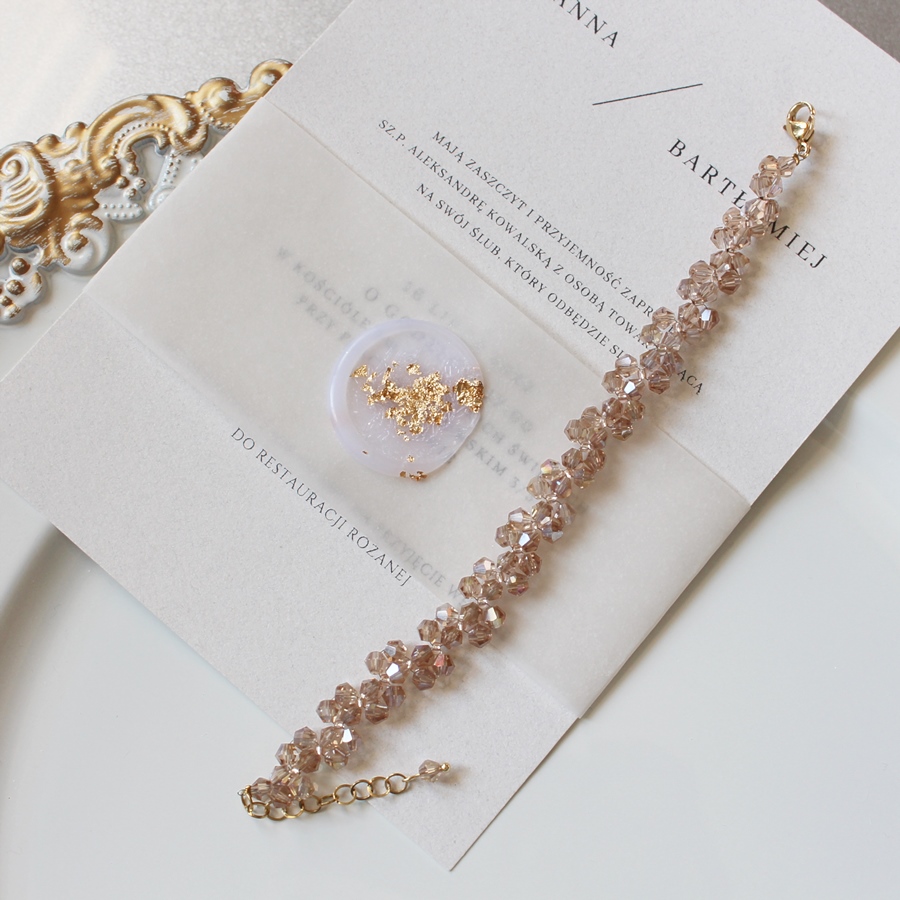 Model wykonany z kryształów szklanych fasetowanych w kolorze złotym. Między kryształami znajdują się szklane koraliki łączące wzór w tym modelu w kolorze rose gold