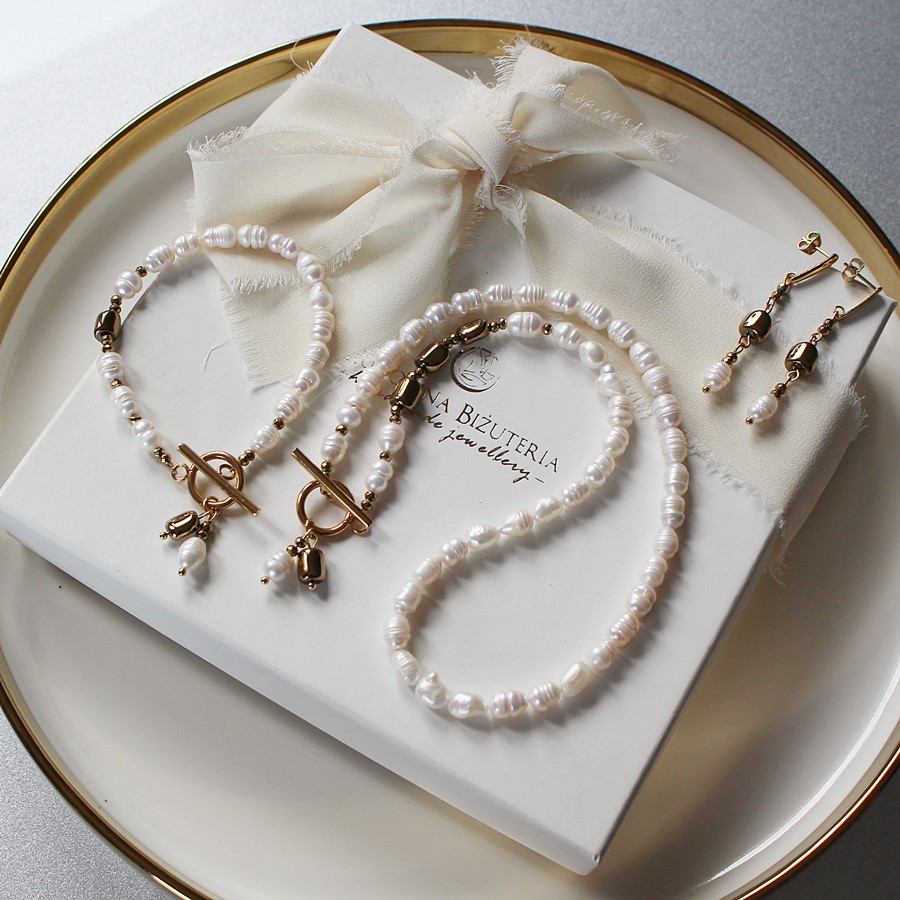 Przedstawiam cudowny zestaw biżuterii z białymi perłami i wkomponowanymi bryłkami złotego hematytu.
