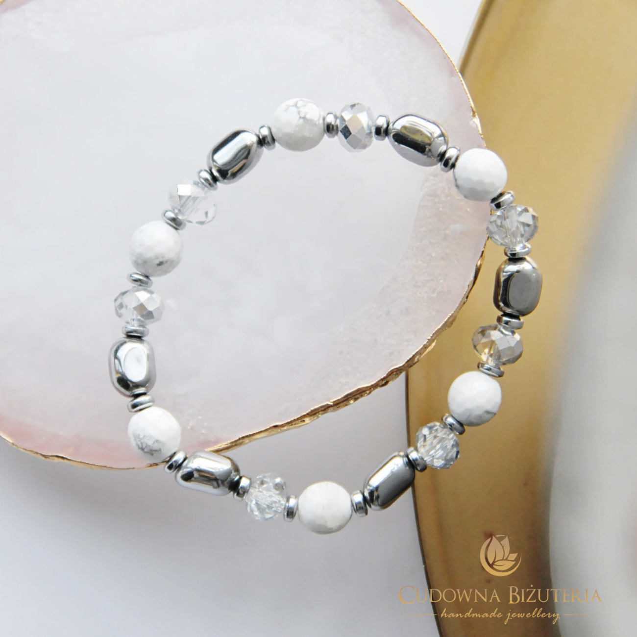 Proponujemy zestaw utrzymany w tonacji czerni i srebra. Materiały w nim użyte to onyx, kryształ, hematyt oraz kamienie białego turkusu.